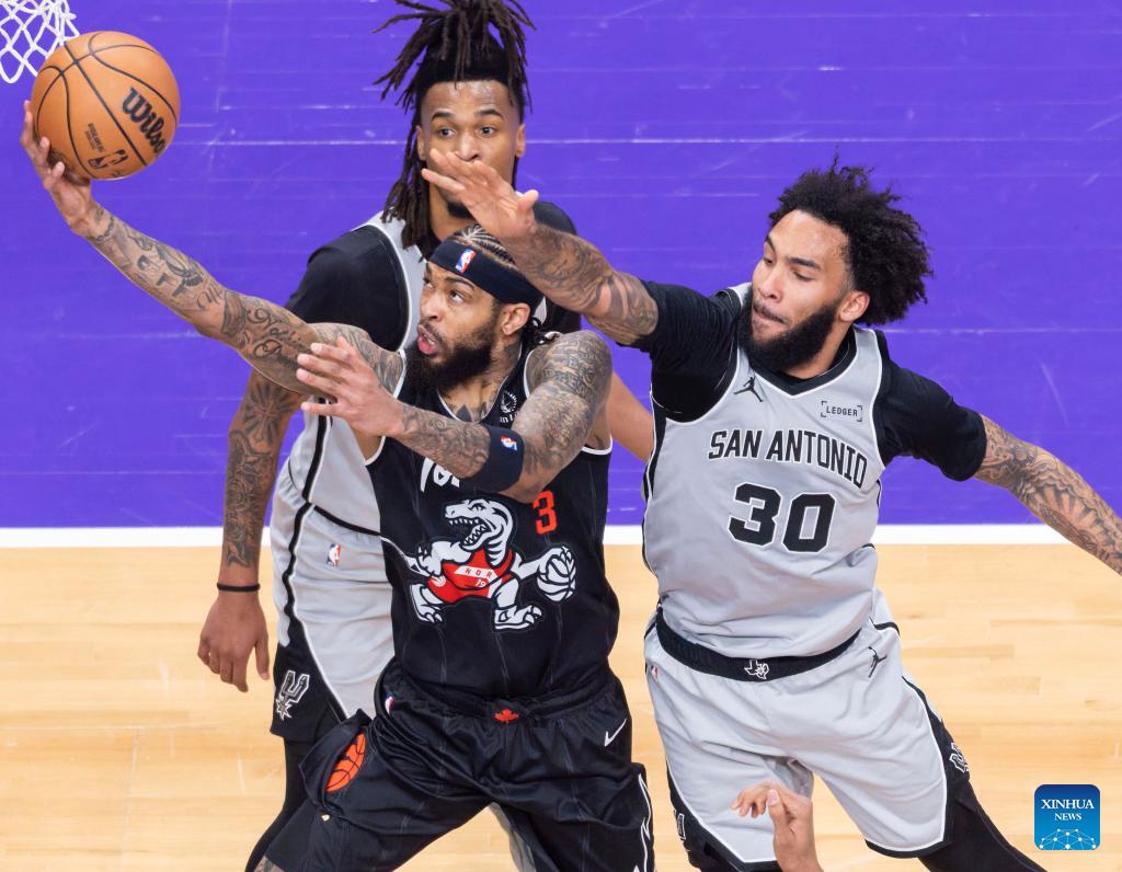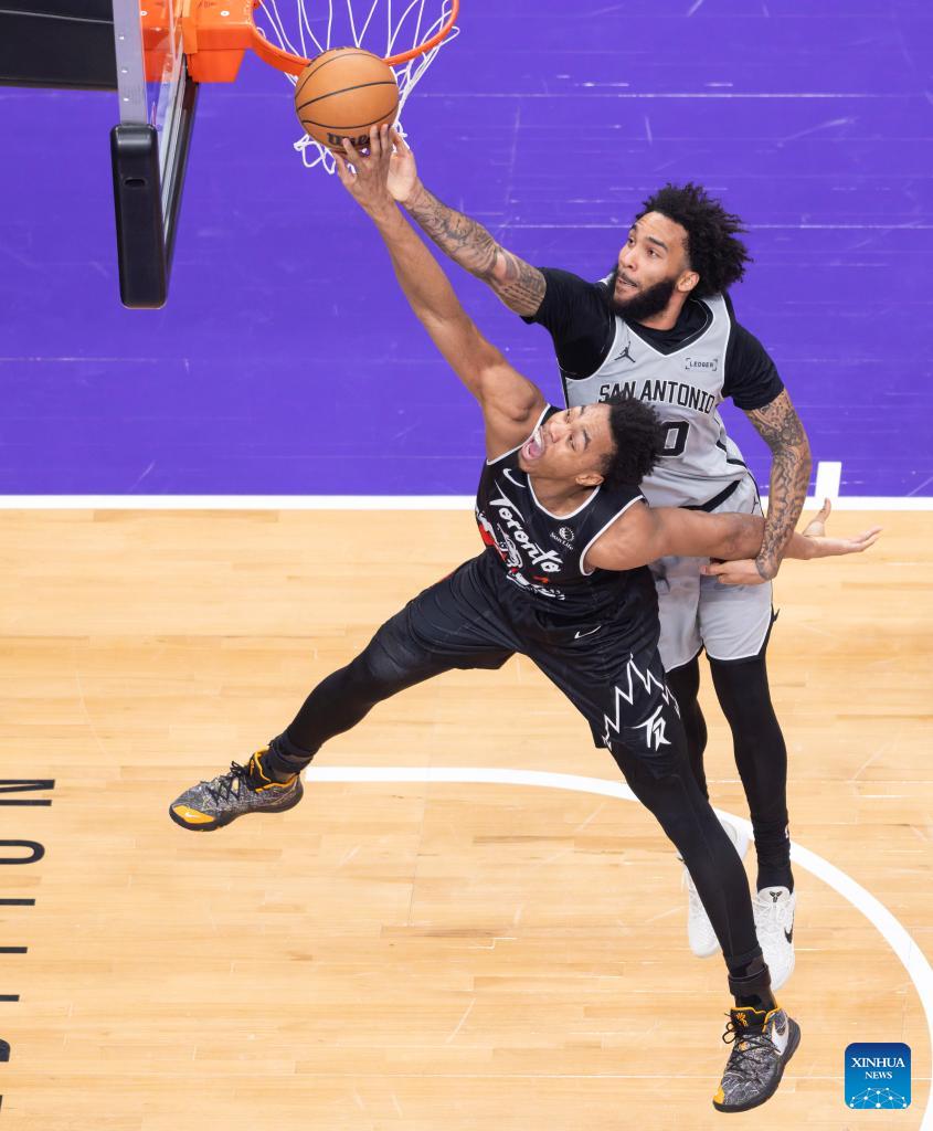 Brandon Ingram (front L) of Toronto Raptors goes for a layup during the 2025-2026 NBA regular season game between Toronto Raptors and San Antonio Spurs in Toronto, Canada, on Feb. 25, 2026. (Photo by Zou Zheng/Xinhua)