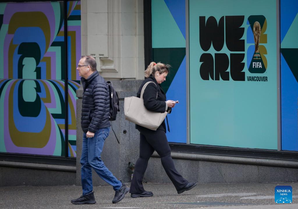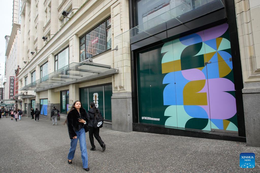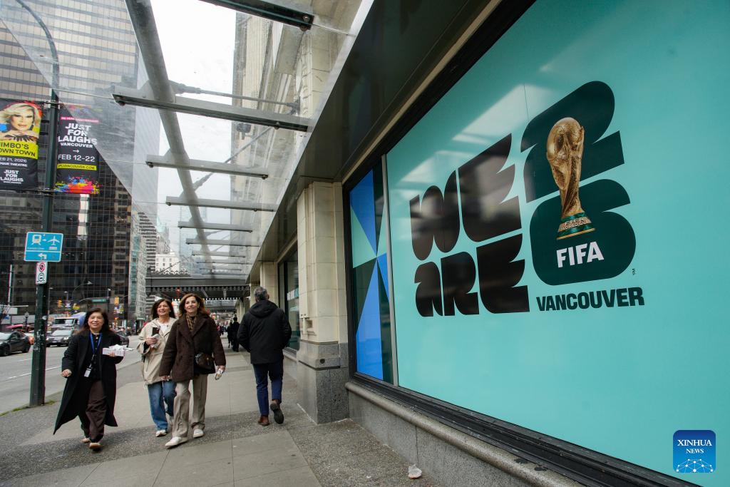 People walk past signage for the 2026 FIFA World Cup displayed outside a building in Vancouver, Canada, on Feb. 26, 2026. Installation of event-related signage and city-dressing elements using official tournament branding standards has begun across downtown Vancouver this month in preparation for the 2026 FIFA World Cup and will continue to expand in the coming months, according to the City of Vancouver. (Photo by Liang Sen/Xinhua)
