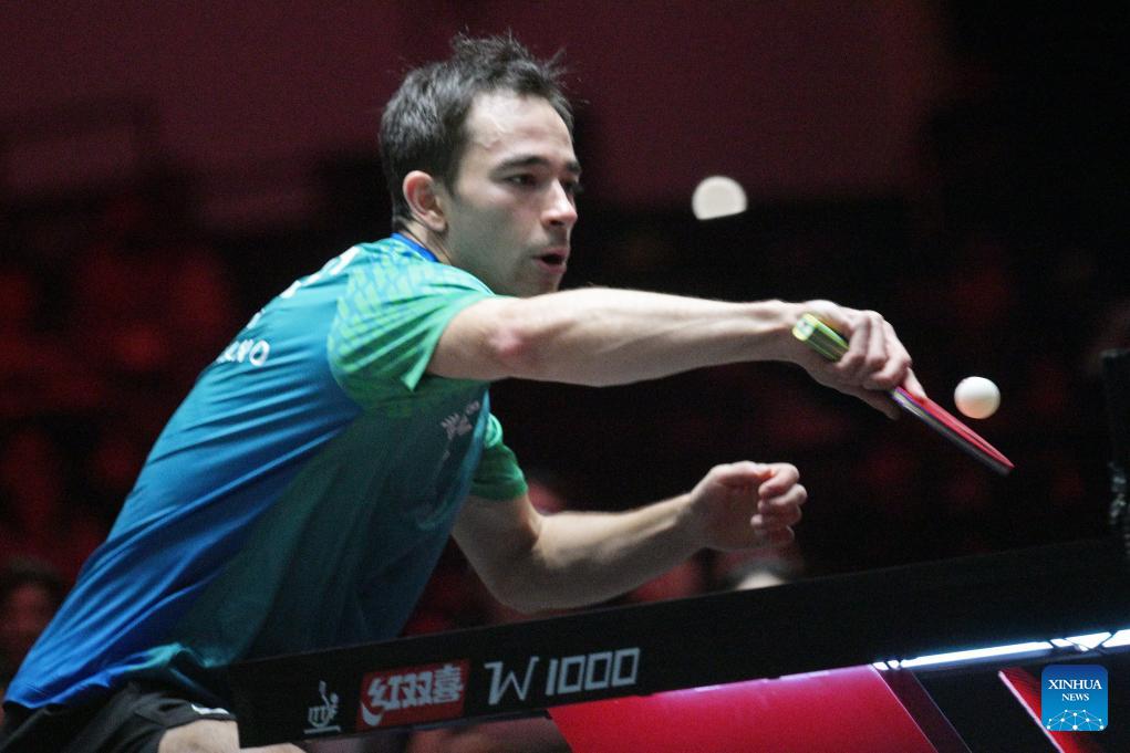 Hugo Calderano hits a return during the men's singles round of 16 match between Chen Yuanyu of China and Hugo Calderano of Brazil at the World Table Tennis (WTT) Singapore Smash 2026 in Singapore on Feb. 27, 2026. (Photo by Then Chih Wey/Xinhua)