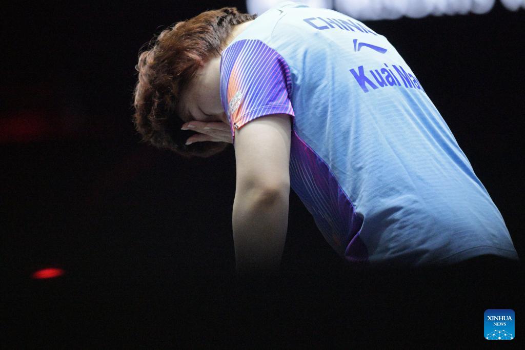 Kuai Man reacts during the women's singles round of 16 match between Kuai Man of China and Hayata Hina of Japan at the World Table Tennis (WTT) Singapore Smash 2026 in Singapore on Feb. 27, 2026. (Photo by Then Chih Wey/Xinhua)