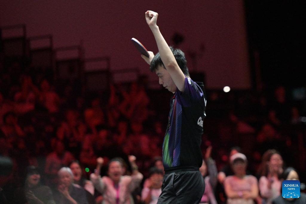 Chen Yuanyu celebrates after winning the men's singles round of 16 match between Chen Yuanyu of China and Hugo Calderano of Brazil at the World Table Tennis (WTT) Singapore Smash 2026 in Singapore on Feb. 27, 2026. (Photo by Then Chih Wey/Xinhua)