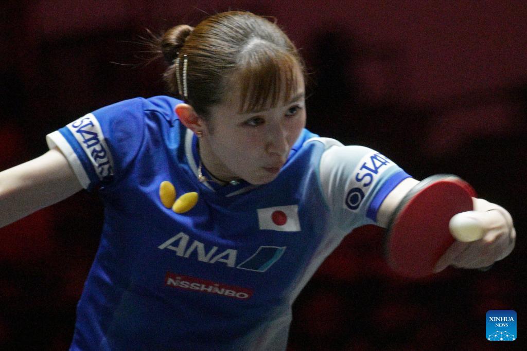 Hayata Hina hits a return during the women's singles round of 16 match between Kuai Man of China and Hayata Hina of Japan at the World Table Tennis (WTT) Singapore Smash 2026 in Singapore on Feb. 27, 2026. (Photo by Then Chih Wey/Xinhua)