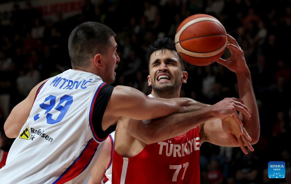 Türkiye's Tarik Biberovic (R) vies with Serbia's Nikola Kalinic during the first round group C match between Serbia and Türkiye at the FIBA Basketball World Cup 2027 European Qualifiers in Belgrade, Serbia, on Feb. 27, 2026. (Photo by Predrag Milosavljevic/Xinhua)