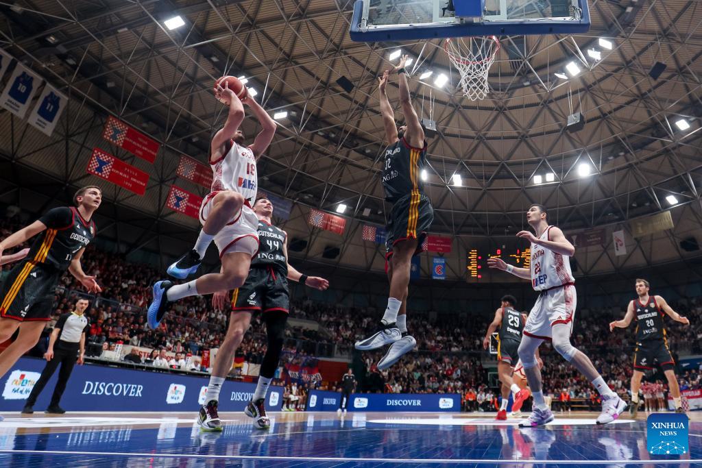 Johannes Thiemann (top) of Germany dunks during the first round group E match between Croatia and Germany at the FIBA Basketball World Cup 2027 European Qualifiers in Zagreb, Croatia, on Feb. 27, 2026. (Igor Kralj/PIXSELL via Xinhua)