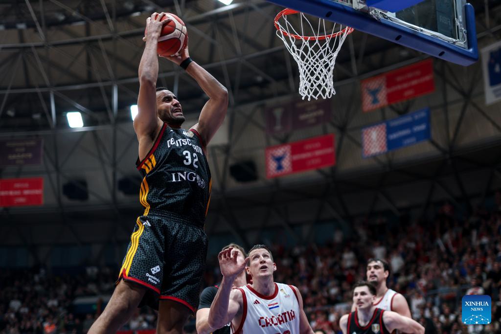 Johannes Thiemann (C) of Germany drives to the basket against Michael Ruzic (2nd R) of Croatia during the first round group E match between Croatia and Germany at the FIBA Basketball World Cup 2027 European Qualifiers in Zagreb, Croatia, on Feb. 27, 2026. (Igor Kralj/PIXSELL via Xinhua)