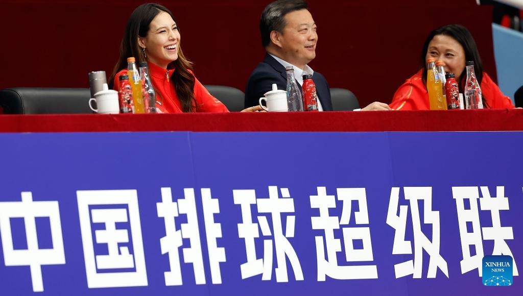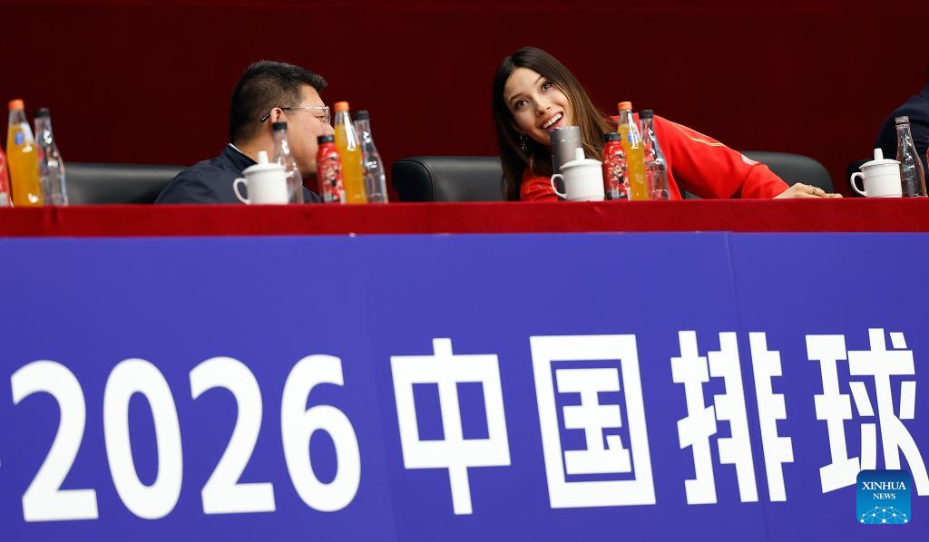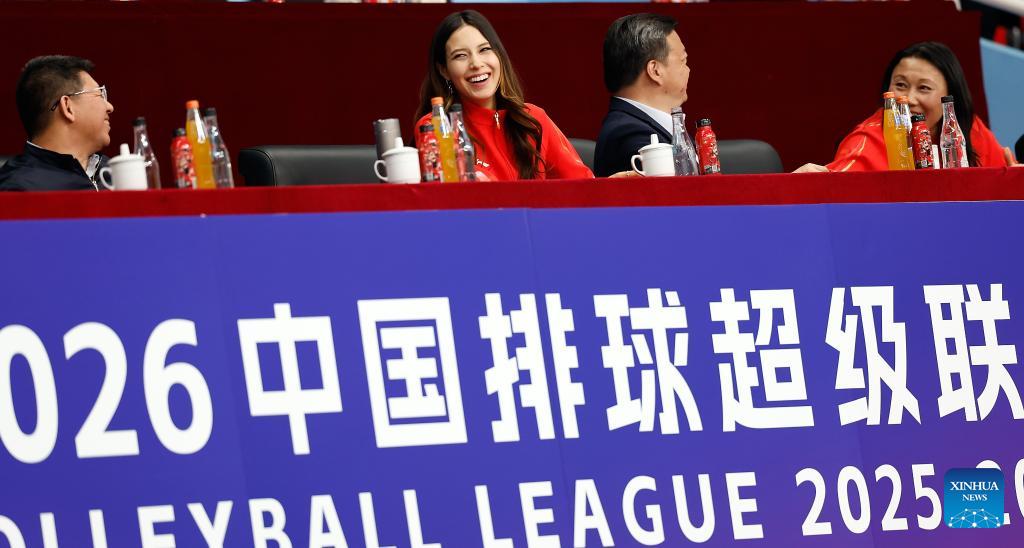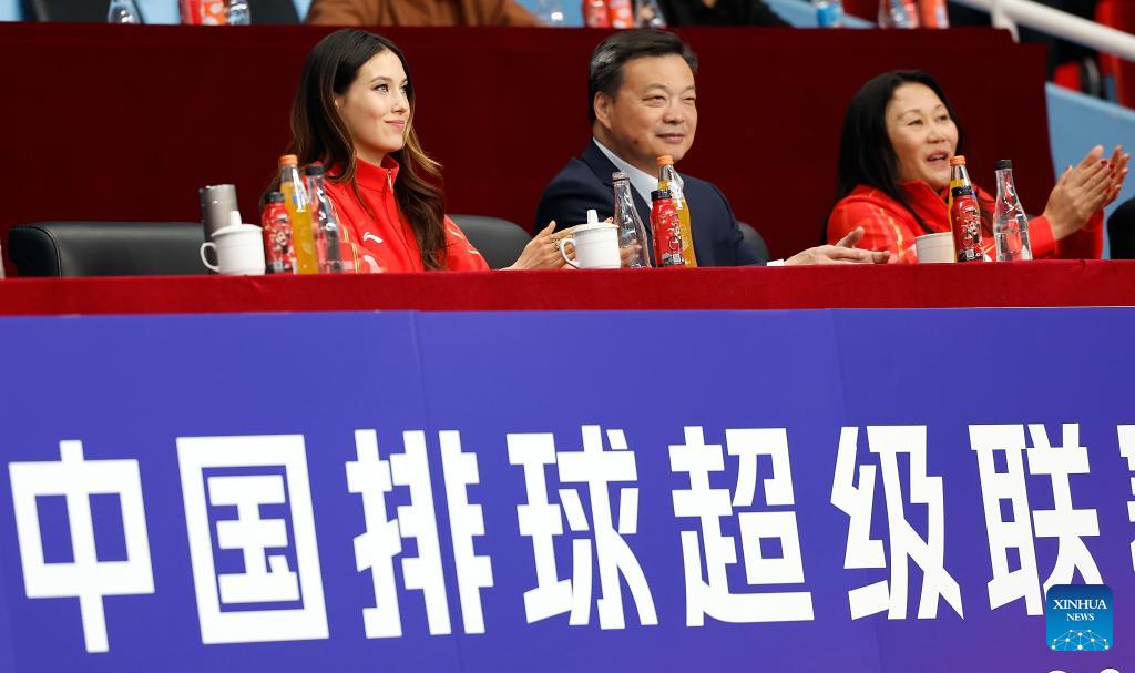 China's freeski Olympic champion Gu Ailing (2nd L) is seen on the stands during the women's playoff match between Beijing and Henan at China Volleyball League 2025-2026 in Beijing, China, Feb. 28, 2026. (Xinhua/Wang Lili)