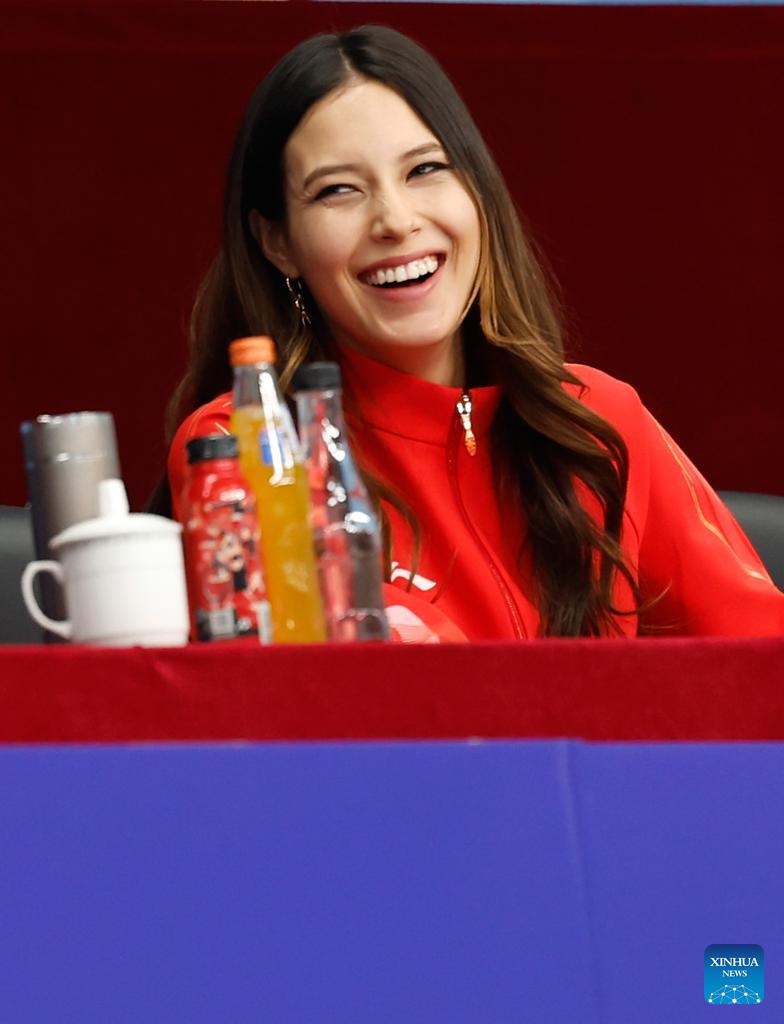 China's freeski Olympic champion Gu Ailing is seen on the stands during the women's playoff match between Beijing and Henan at China Volleyball League 2025-2026 in Beijing, China, Feb. 28, 2026. (Xinhua/Wang Lili)