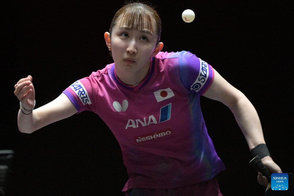 Hayata Hina serves during the women's singles quarterfinal between Sun Yingsha of China and Hayata Hina of Japan at the World Table Tennis (WTT) Singapore Smash 2026 in Singapore on Feb. 28, 2026. (Photo by Then Chih Wey/Xinhua)