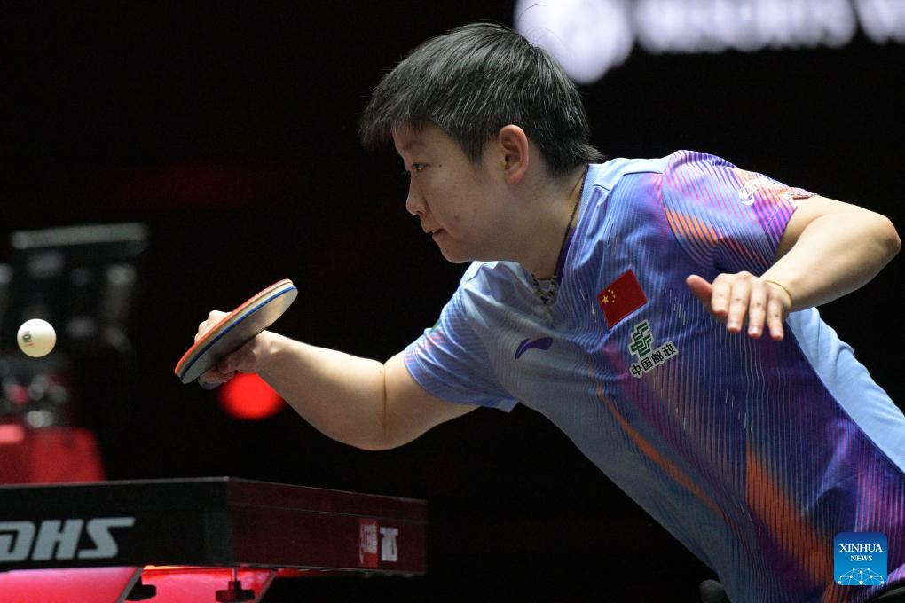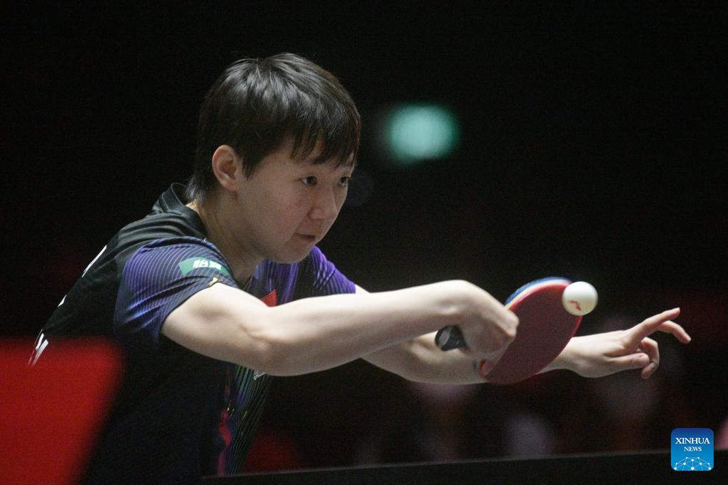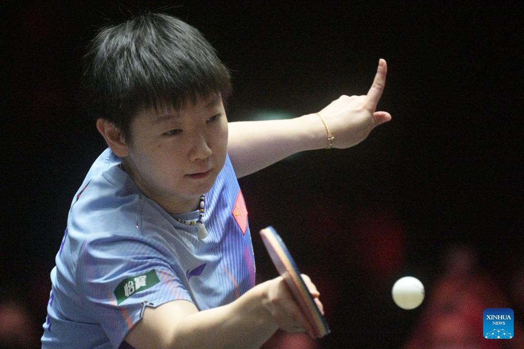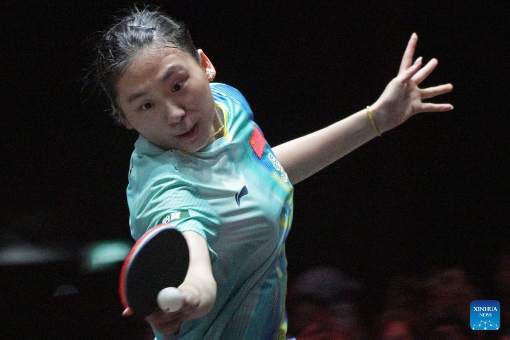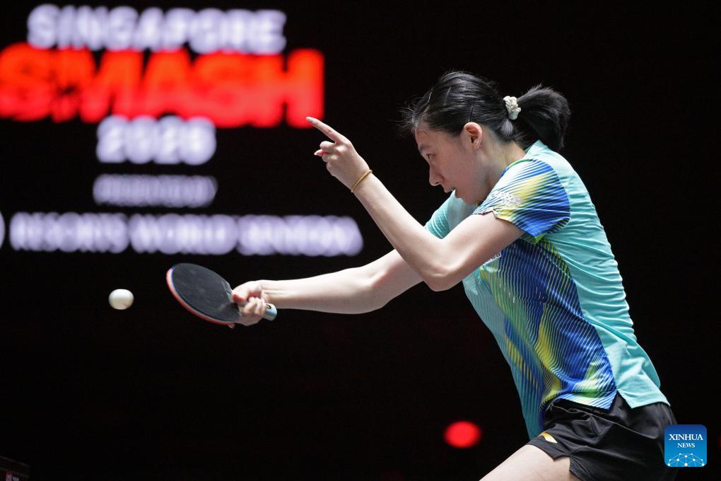 Wang Manyu hits a return during the women's singles semifinal between Wang Manyu of China and Sabine Winter of Germany at the World Table Tennis (WTT) Singapore Smash 2026 in Singapore on March 1, 2026. (Photo by Then Chih Wey/Xinhua)