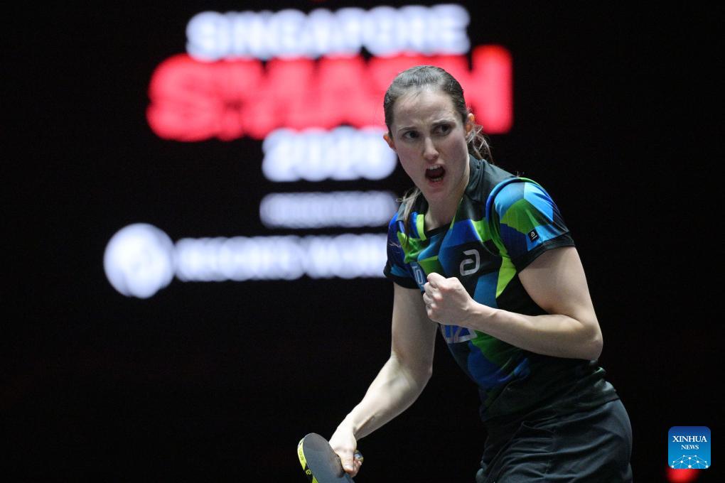 Sabine Winter celebrates scoring during the women's singles semifinal between Wang Manyu of China and Sabine Winter of Germany at the World Table Tennis (WTT) Singapore Smash 2026 in Singapore on March 1, 2026. (Photo by Then Chih Wey/Xinhua)