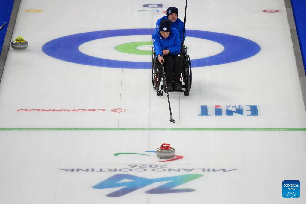 Orietta Berto (front) of Italy competes during the wheelchair curling mixed doubles round robin session 3 match between China and Italy at the Milan-Cortina 2026 Paralympic Winter Games in Cortina D'ampezzo, Italy, March 5, 2026. (Xinhua/Lian Yi)