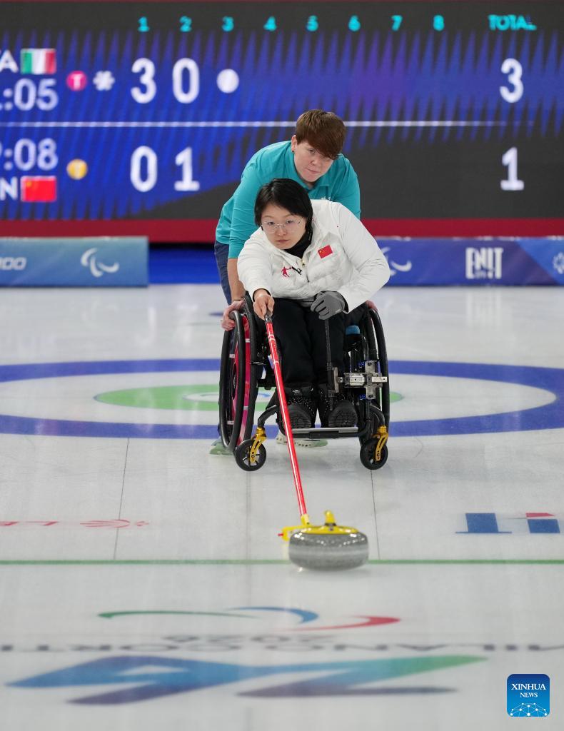 Wang Meng of China competes during the wheelchair curling mixed doubles round robin session 3 match between China and Italy at the Milan-Cortina 2026 Paralympic Winter Games in Cortina D'ampezzo, Italy, March 5, 2026. (Xinhua/Lian Yi)