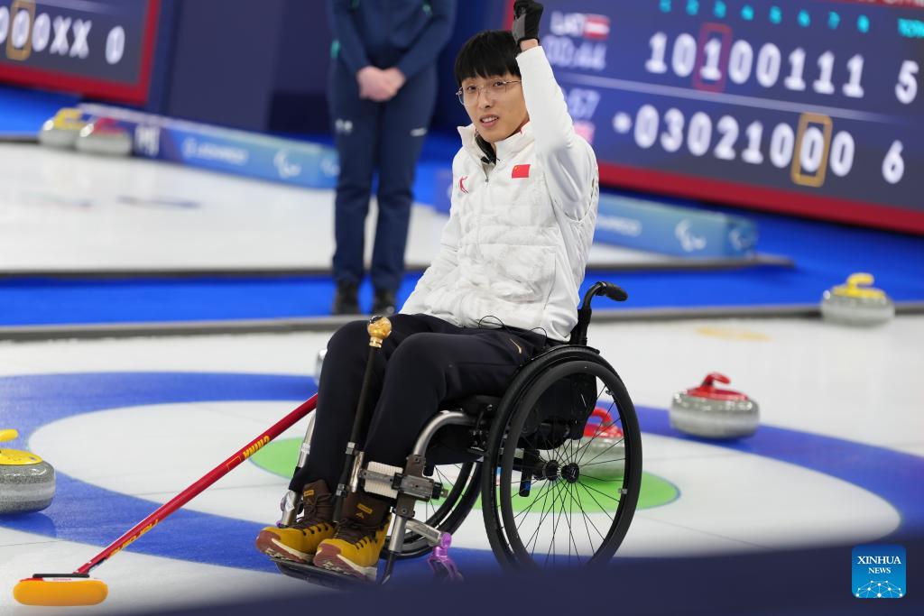 Yang Jinqiao of China celebrates after the wheelchair curling mixed doubles round robin session 3 match between China and Italy at the Milan-Cortina 2026 Paralympic Winter Games in Cortina D'ampezzo, Italy, March 5, 2026. (Xinhua/Lian Yi)