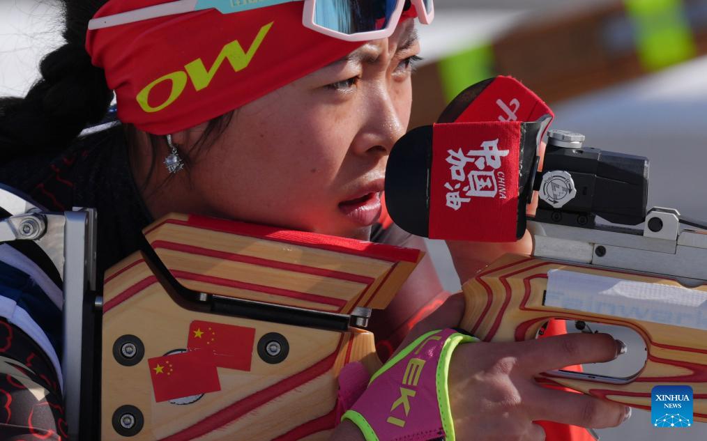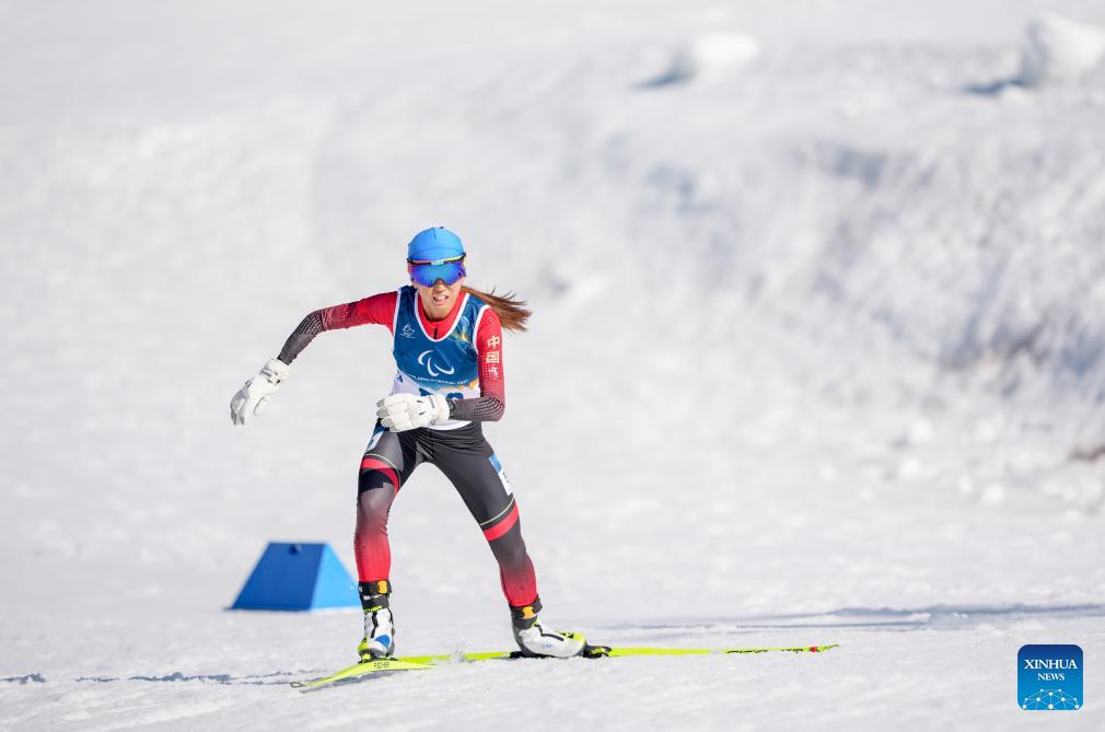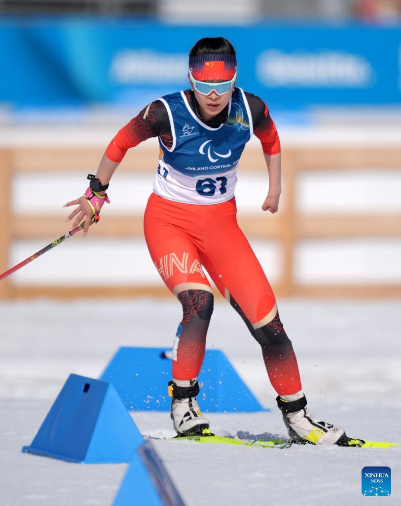 Guo Yujie of China competes during the women's sprint standing final of para biathlon at the Milan-Cortina 2026 Paralympic Winter Games in Tesero, Italy, March 7, 2026. (Xinhua/Cai Yang)