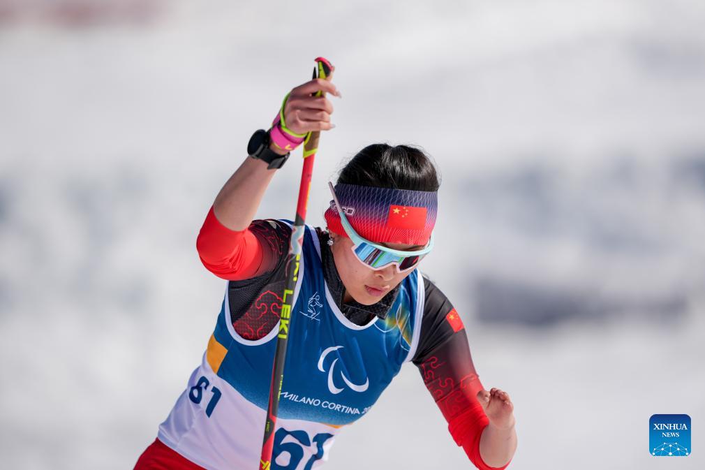 Zhao Zhiqing of China competes during the women's sprint standing final of para biathlon at the Milan-Cortina 2026 Paralympic Winter Games in Tesero, Italy, March 7, 2026. (Xinhua/Lian Zhen)