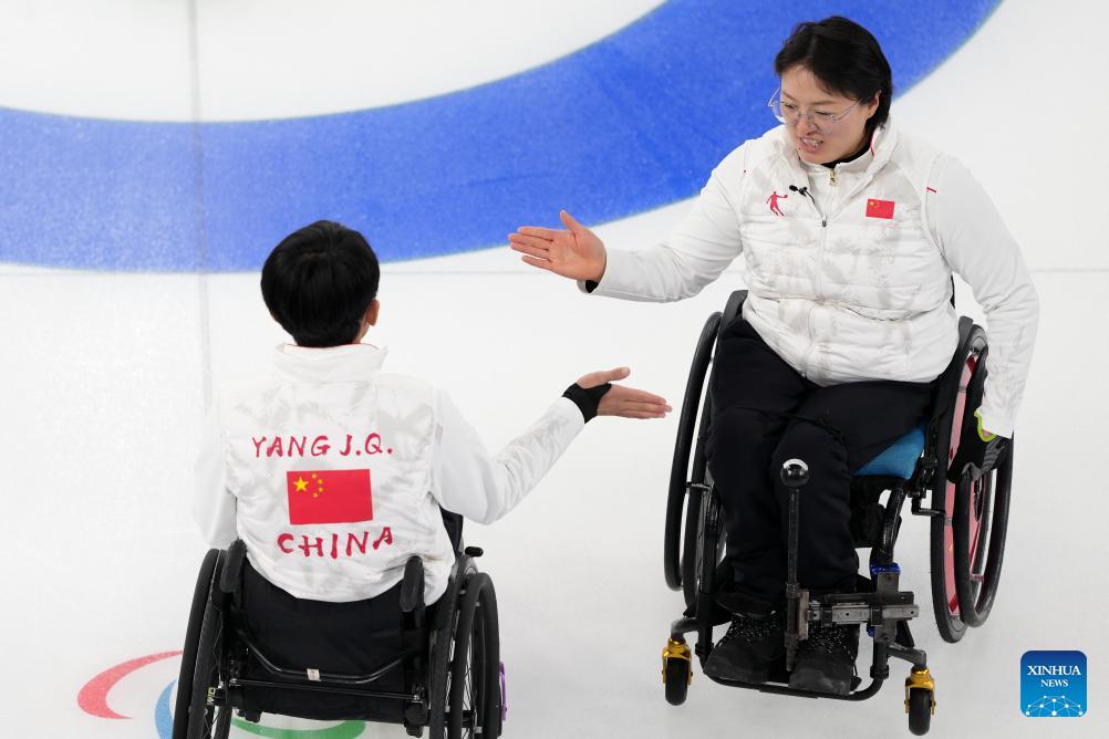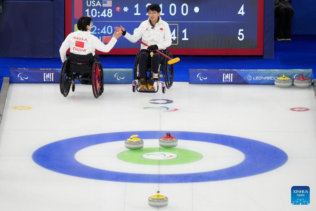 Wang Meng (R) of China competes during the wheelchair curling mixed doubles round robin session 7 between China and the United States at the Milan-Cortina 2026 Paralympic Winter Games in Cortina D'ampezzo, Italy, March 9, 2026. (Xinhua/Lian Yi)