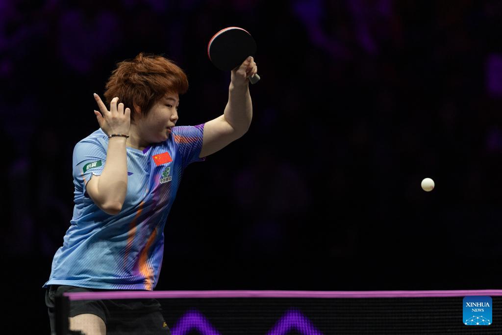 Kuai Man of China hits a return during the women's singles round of 32 match against Elizabeta Samara of Romania at the WTT Champions Chongqing 2026 in southwest China's Chongqing, March 10, 2026. (Xinhua/Chen Cheng)