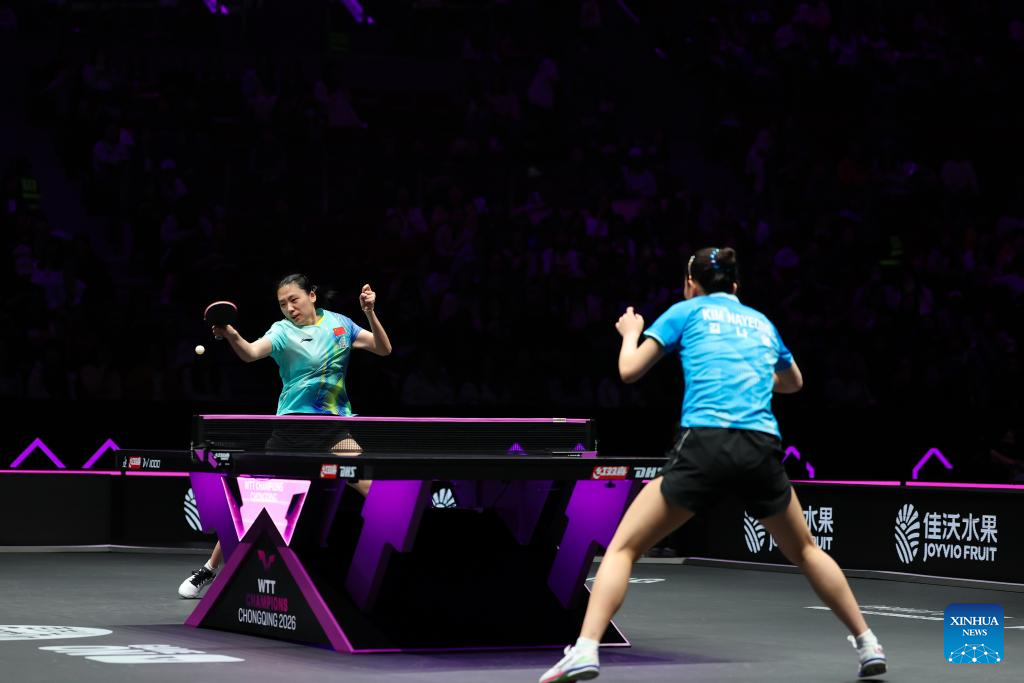 Chen Yi (L) hits a return during the women's singles round of 32 match between Chen Yi of China and Kim Nayeong of South Korea at the WTT Champions Chongqing 2026 in southwest China's Chongqing, March 11, 2026. (Xinhua/Huang Wei)