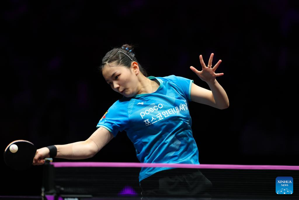 Kim Nayeong hits a return during the women's singles round of 32 match between Chen Yi of China and Kim Nayeong of South Korea at the WTT Champions Chongqing 2026 in southwest China's Chongqing, March 11, 2026. (Xinhua/Huang Wei)