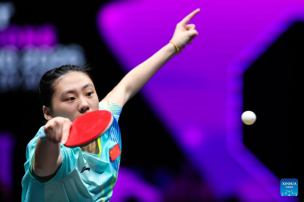 Chen Yi hits a return during the women's singles round of 32 match between Chen Yi of China and Kim Nayeong of South Korea at the WTT Champions Chongqing 2026 in southwest China's Chongqing, March 11, 2026. (Xinhua/Huang Wei)