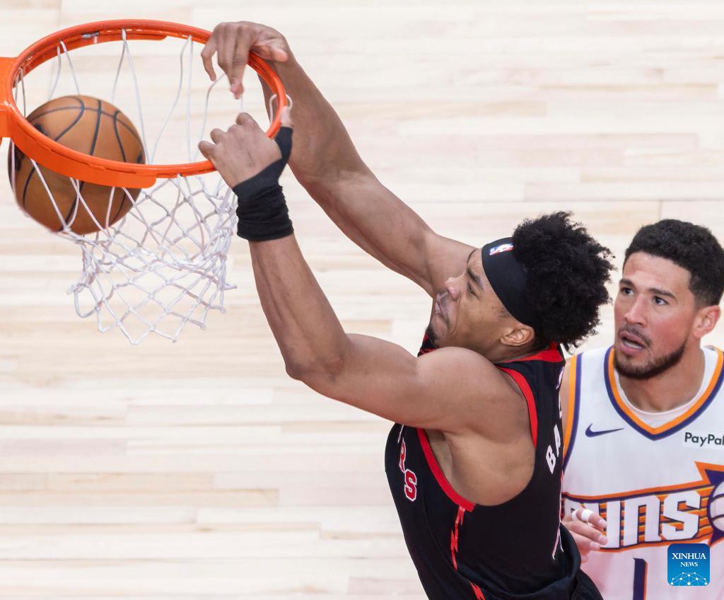 Scottie Barnes (L) of Toronto Raptors dunks during the 2025-2026 NBA regular season game between Toronto Raptors and Phoenix Suns in Toronto, Canada, on March 13, 2026. (Photo by Zou Zheng/Xinhua)
