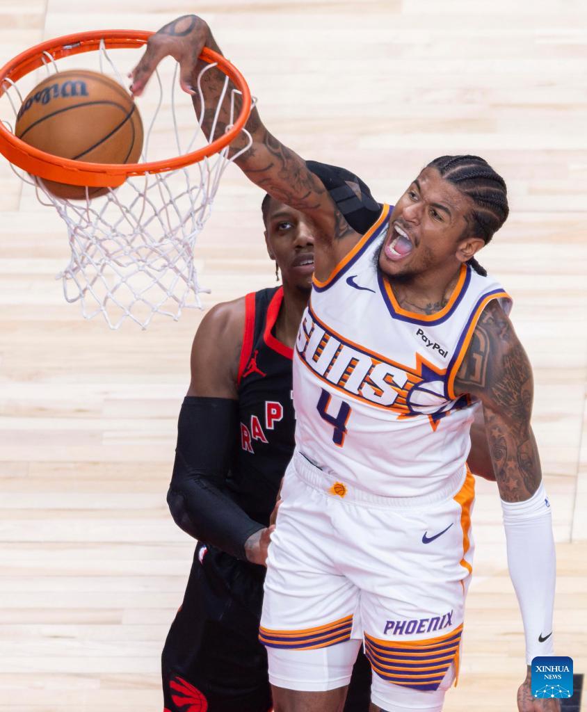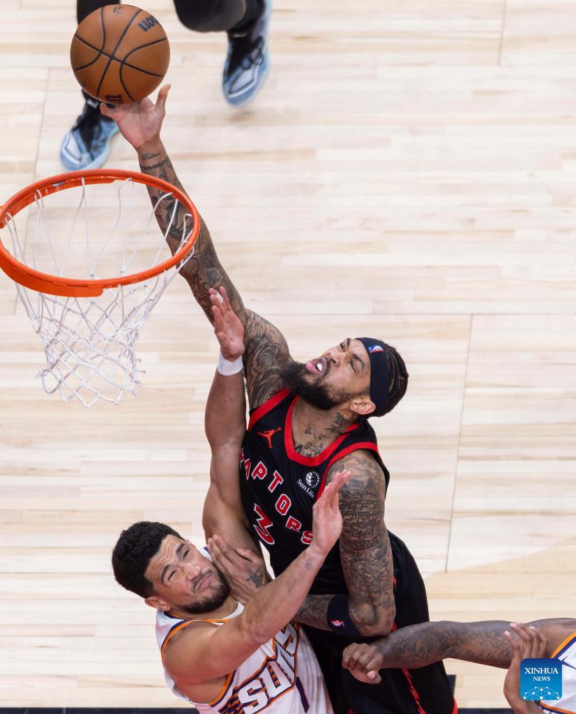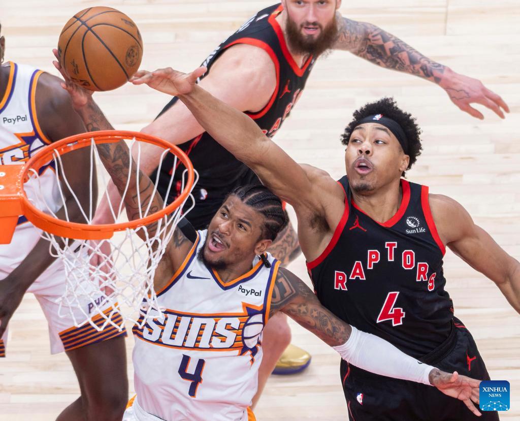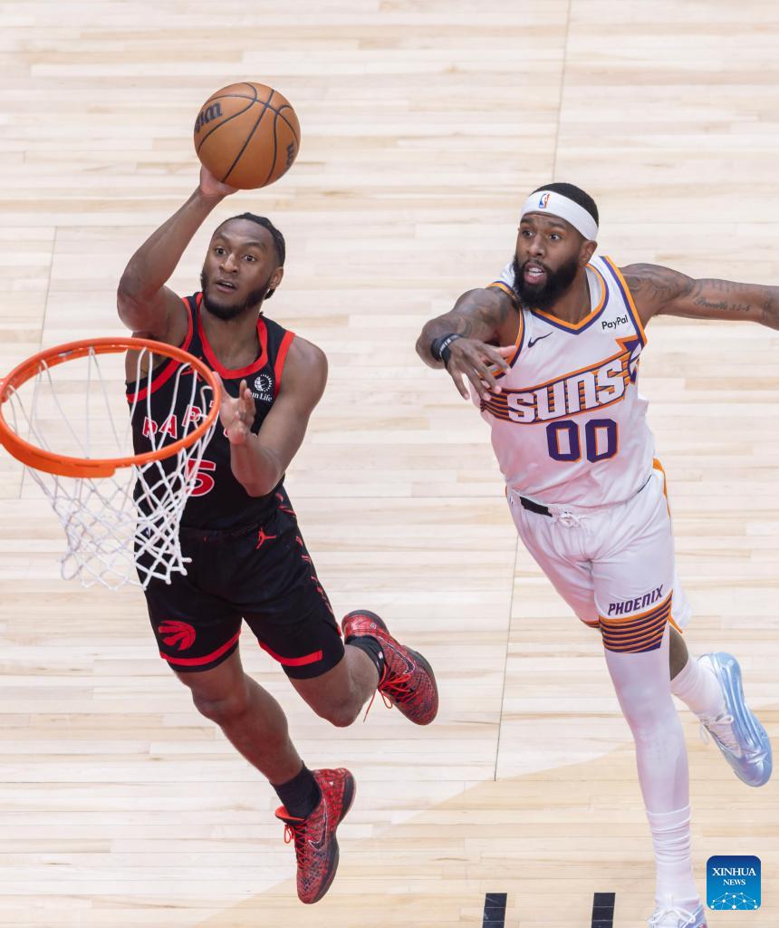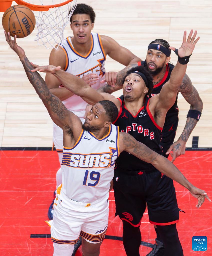 Haywood Highsmith (front L) of Phoenix Suns goes for a layup during the 2025-2026 NBA regular season game between Toronto Raptors and Phoenix Suns in Toronto, Canada, on March 13, 2026. (Photo by Zou Zheng/Xinhua)