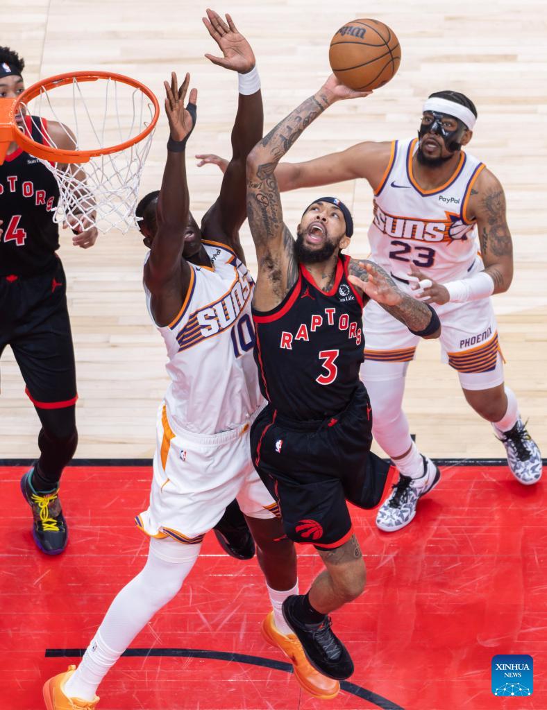 Brandon Ingram (2nd R) of Toronto Raptors goes for a layup during the 2025-2026 NBA regular season game between Toronto Raptors and Phoenix Suns in Toronto, Canada, on March 13, 2026. (Photo by Zou Zheng/Xinhua)