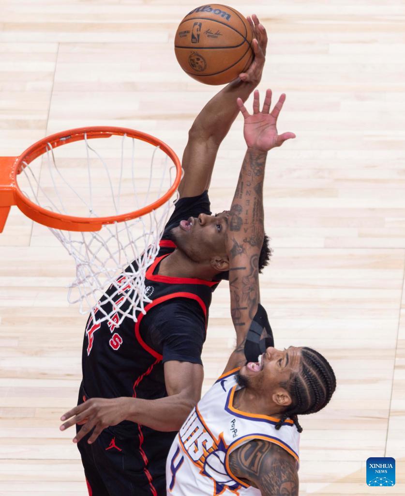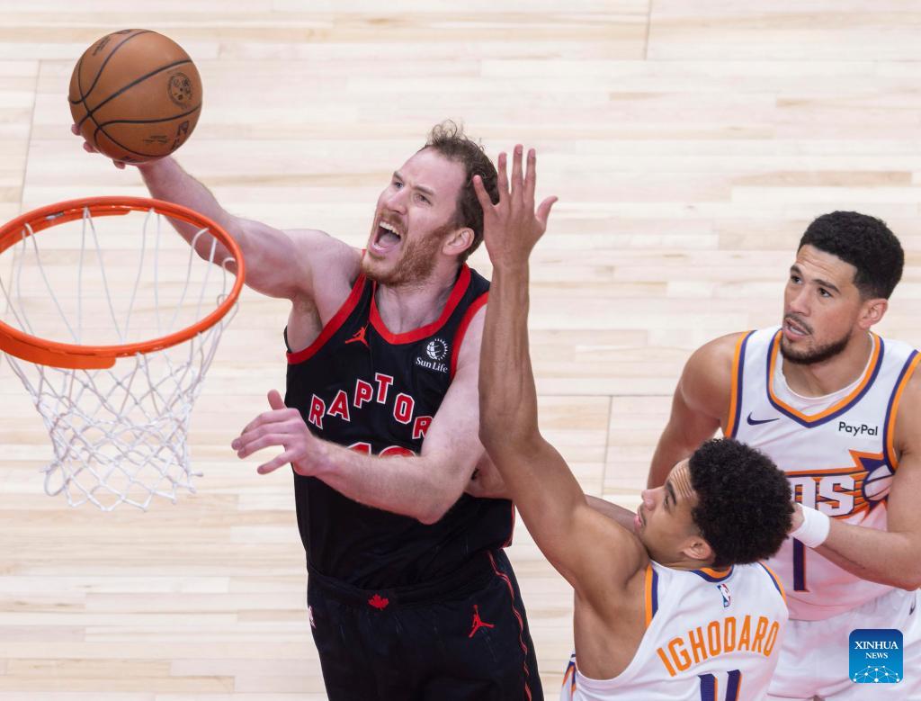 Jakob Poeltl (L) of Toronto Raptors goes up for a layup during the 2025-2026 NBA regular season game between Toronto Raptors and Phoenix Suns in Toronto, Canada, on March 13, 2026. (Photo by Zou Zheng/Xinhua)
