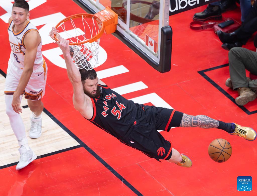 Sandro Mamukelashvili (R) of Toronto Raptors dunks during the 2025-2026 NBA regular season game between Toronto Raptors and Phoenix Suns in Toronto, Canada, on March 13, 2026. (Photo by Zou Zheng/Xinhua)