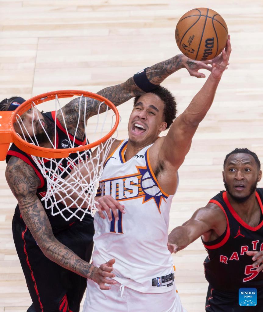 Oso Ighodaro (C) of Phoenix Suns goes for a layup during the 2025-2026 NBA regular season game between Toronto Raptors and Phoenix Suns in Toronto, Canada, on March 13, 2026. (Photo by Zou Zheng/Xinhua)