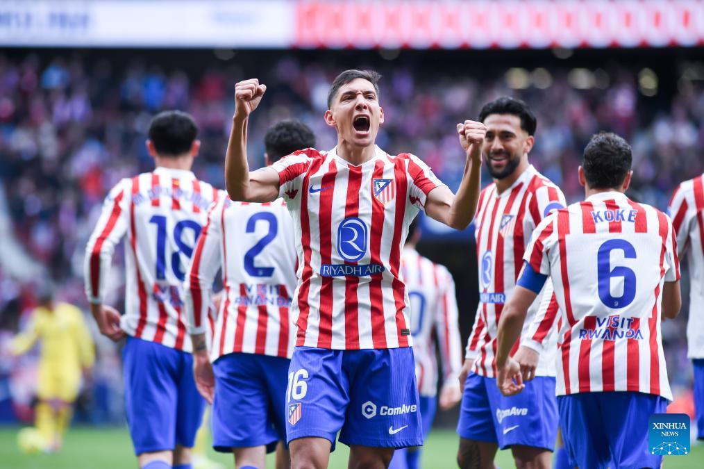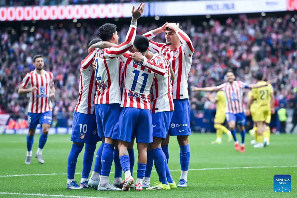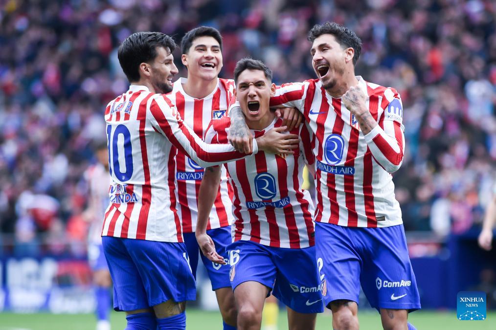 Atletico de Madrid's players celebrate a goal during La Liga football match between Atletico de Madrid and Getafe CF in Madrid, Spain, March 14, 2026. (Photo by Gustavo Valiente/Xinhua)
