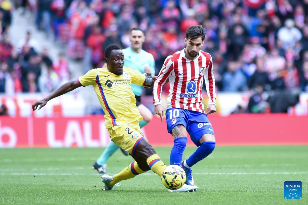 Atletico de Madrid's Alex Baena (R) vies with Getafe's Dakonam Djene during La Liga football match between Atletico de Madrid and Getafe CF in Madrid, Spain, March 14, 2026. (Photo by Gustavo Valiente/Xinhua)