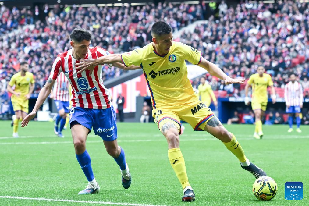 Atletico de Madrid's Alex Baena (R) vies with Getafe's Luis Milla during La Liga football match between Atletico de Madrid and Getafe CF in Madrid, Spain, March 14, 2026. (Photo by Gustavo Valiente/Xinhua)