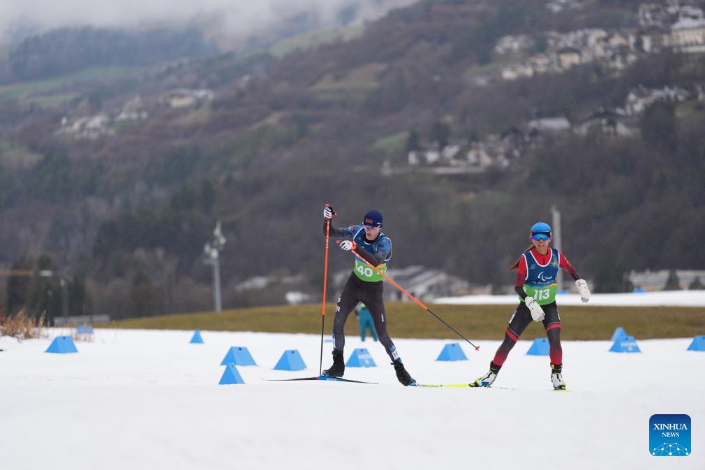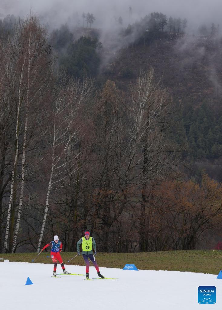 Cong Jihong (R) and her guide Liu Jiaxuan of China compete during the para cross-country skiing women's 20km interval start free vision impaired at the Milan-Cortina 2026 Paralympic Winter Games in Tesero, Italy, March 15, 2026. (Xinhua/Lian Zhen)