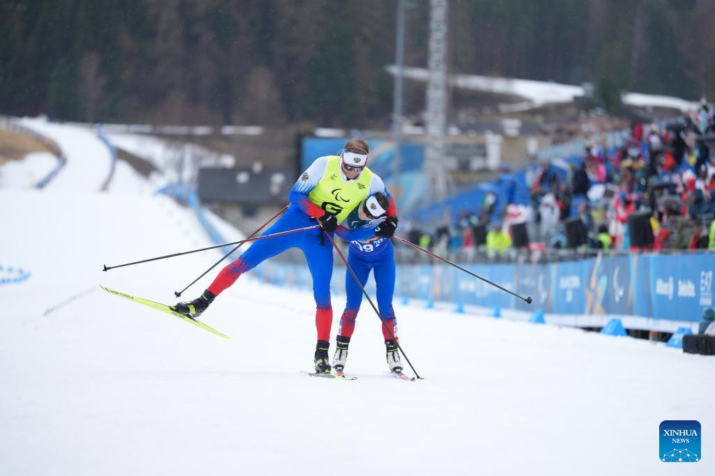 Anastasiia Bagiian (R) and her guide Sergei Siniakin of Russia celebrate after the para cross-country skiing women's 20km interval start free vision impaired at the Milan-Cortina 2026 Paralympic Winter Games in Tesero, Italy, March 15, 2026. (Xinhua/Hou Zhaokang)