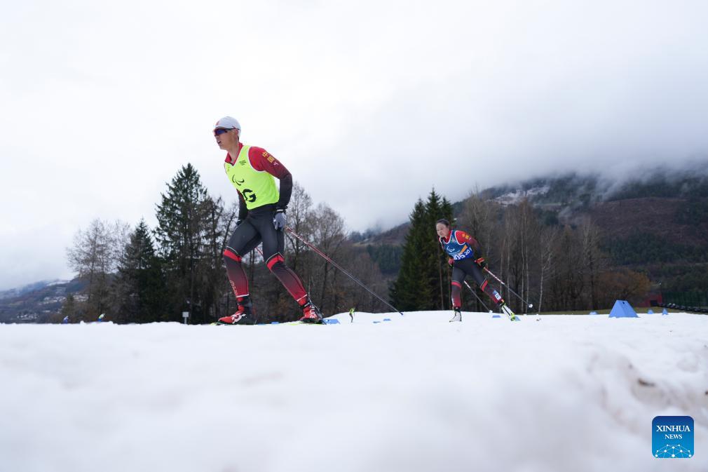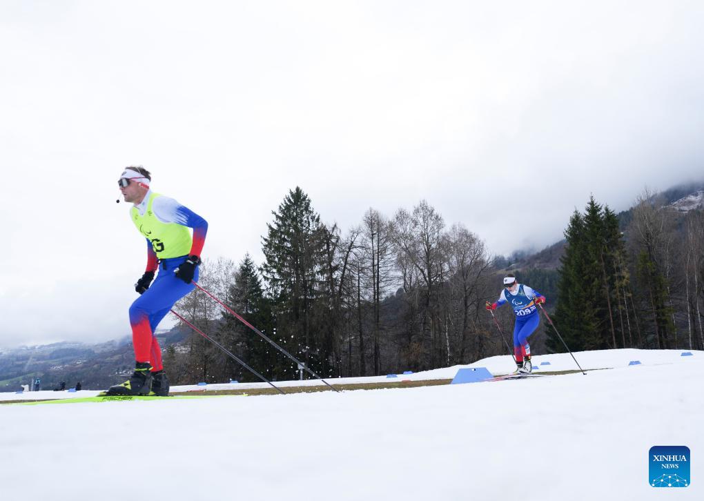 Raman Svirydzenka (L) of Balerus competes during the para cross-country skiing men's 20km interval start free standing at the Milan-Cortina 2026 Paralympic Winter Games in Tesero, Italy, March 15, 2026. (Xinhua/Lian Zhen)