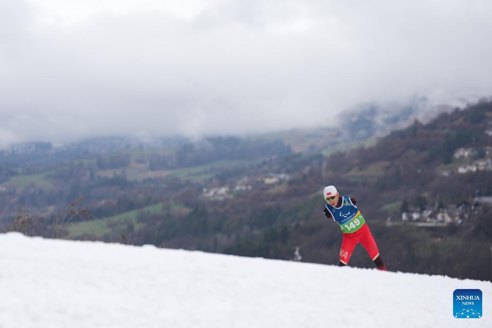Wang Chenyang of China competes during the para cross-country skiing men's 20km interval start free standing at the Milan-Cortina 2026 Paralympic Winter Games in Tesero, Italy, March 15, 2026. (Xinhua/Lian Zhen)