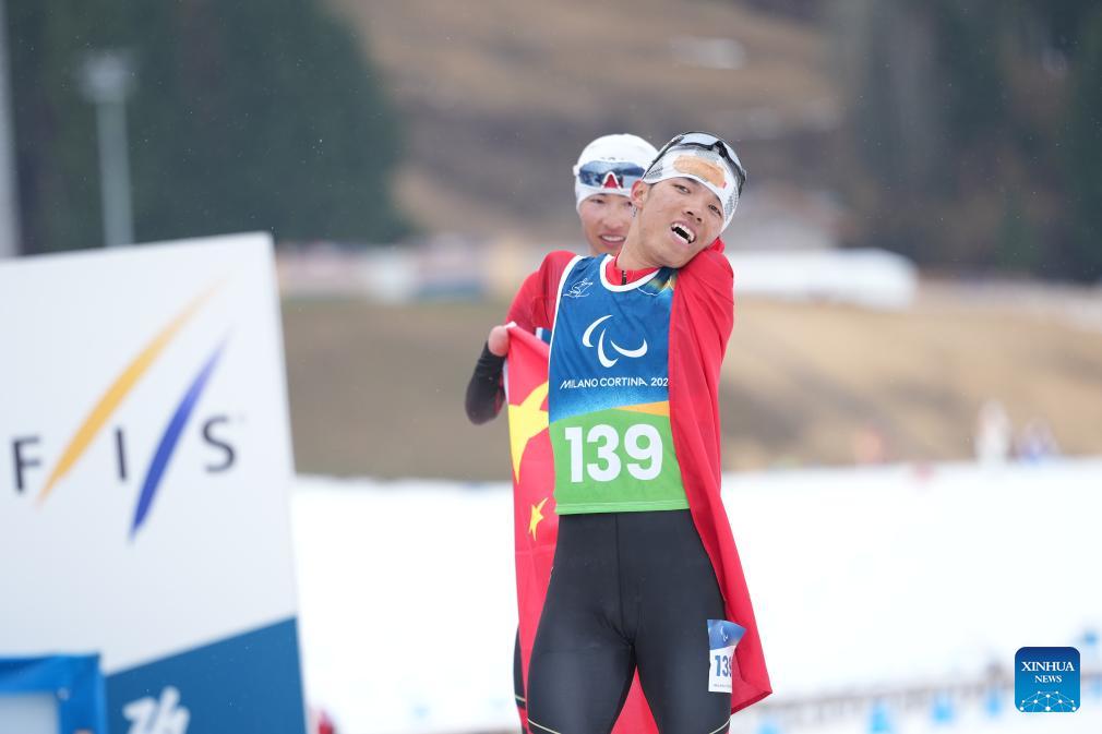 Huang Lingxin (front) of China celebrates after the para cross-country skiing men's 20km interval start free standing at the Milan-Cortina 2026 Paralympic Winter Games in Tesero, Italy, March 15, 2026. (Xinhua/Hou Zhaokang)