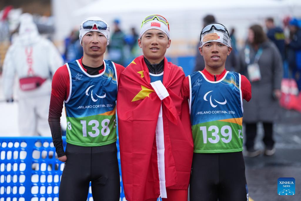 Gold medalist Wang Chenyang (C), silver medalist Huang Lingxin (R), bronze medalist Liu Xiaobin of China pose after the para cross-country skiing men's 20km interval start free standing at the Milan-Cortina 2026 Paralympic Winter Games in Tesero, Italy, March 15, 2026. (Xinhua/Hou Zhaokang)