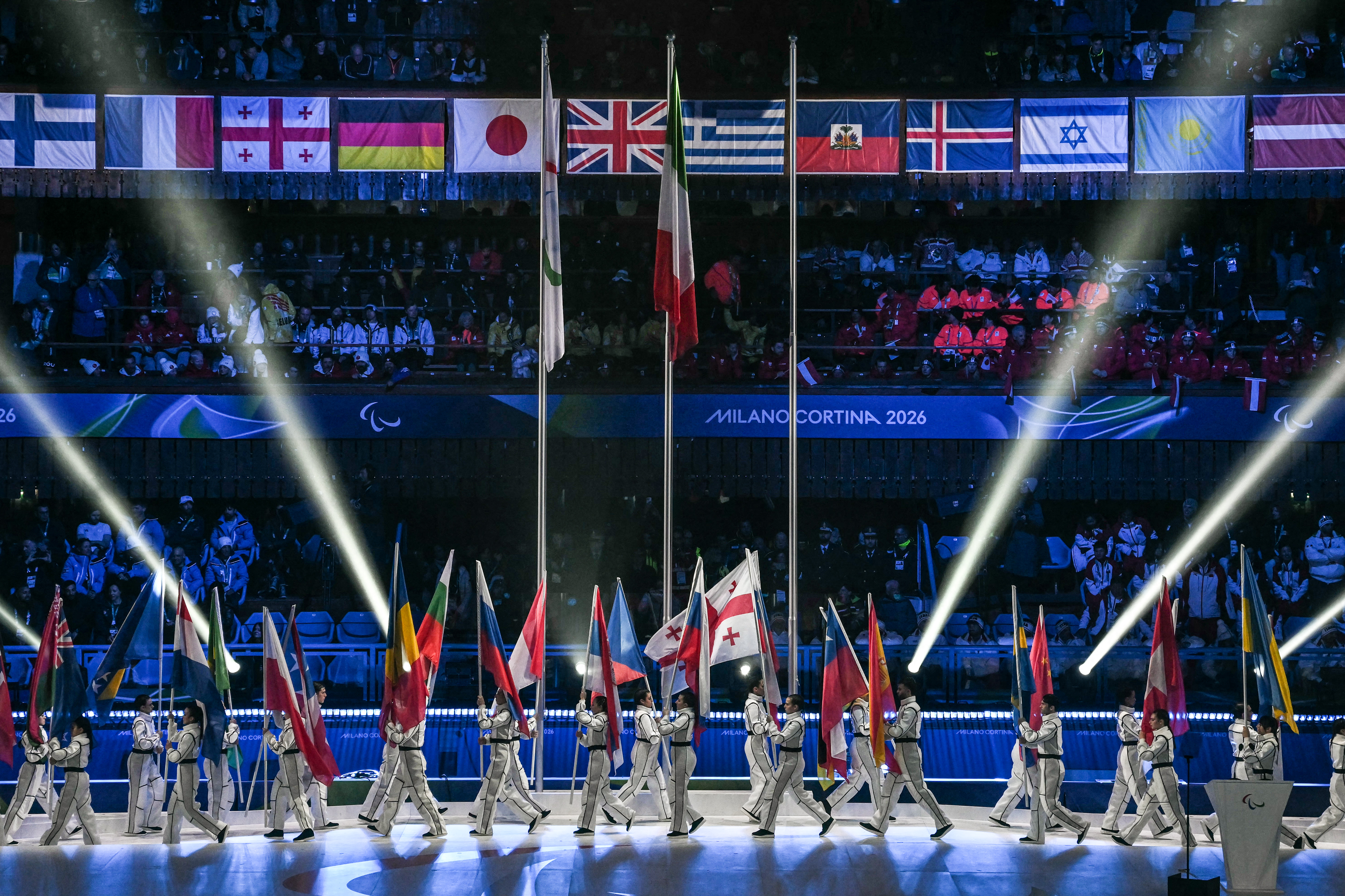 Volunteers parade with flags of countries during the Milano Cortina 2026 Winter Paralympic Games closing ceremony at the Olympic Ice Stadium in Cortina d'Ampezzo, on March 15, 2026. (Photo: AFP)