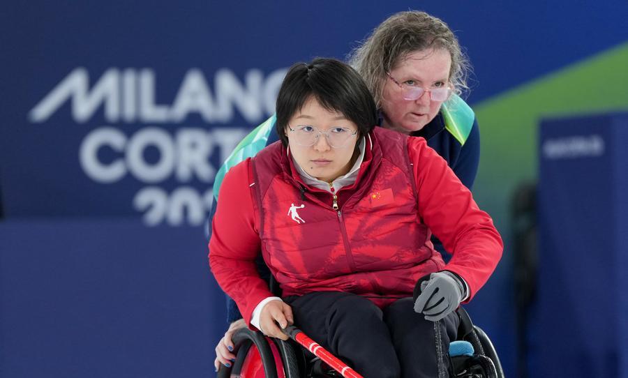 Wang Meng (front) of China competes during the wheelchair curling mixed doubles round robin session 4 match between China and South Korea at the Milan-Cortina 2026 Paralympic Winter Games in Cortina D'ampezzo, Italy, March 6, 2026. (Photo: Xinhua)