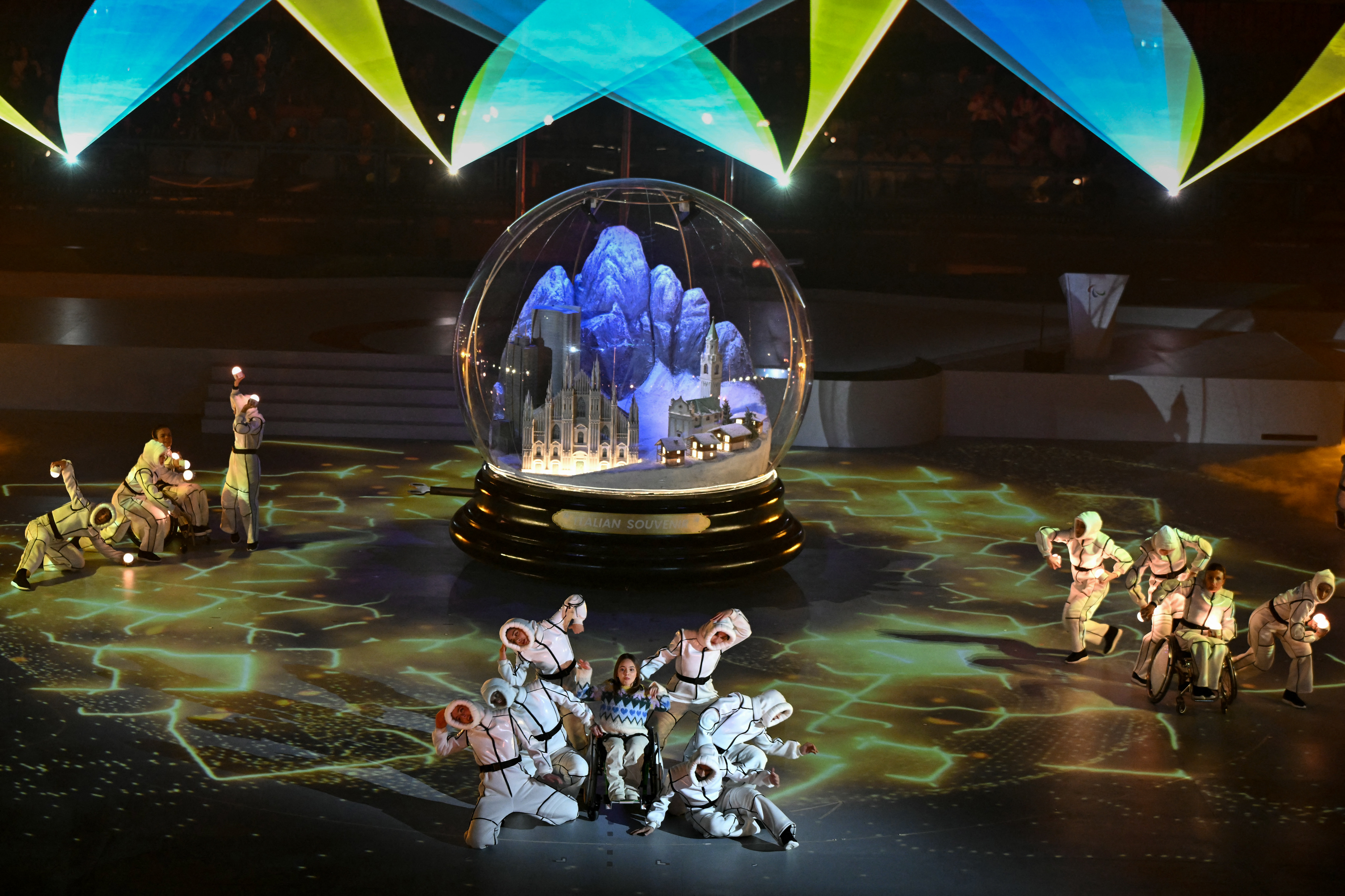 Performers take part in the Milano Cortina 2026 Winter Paralympic Games closing ceremony at the Olympic Ice Stadium in Cortina d'Ampezzo, on March 15, 2026. (Photo: AFP)