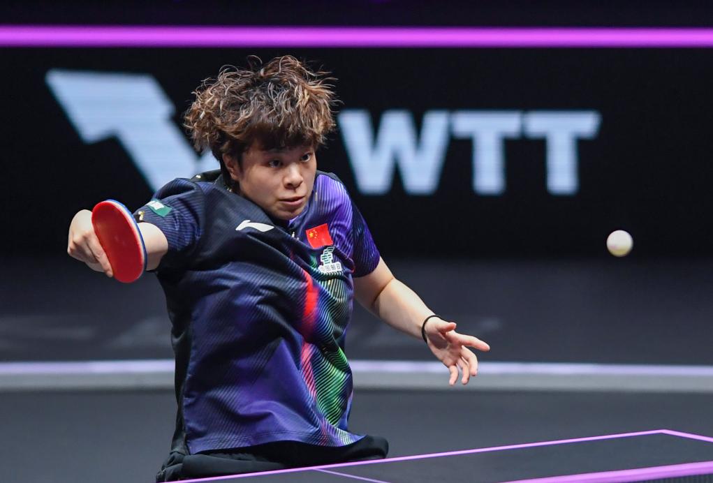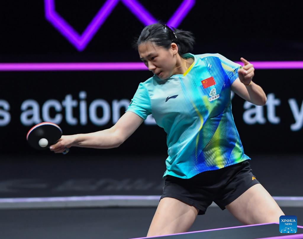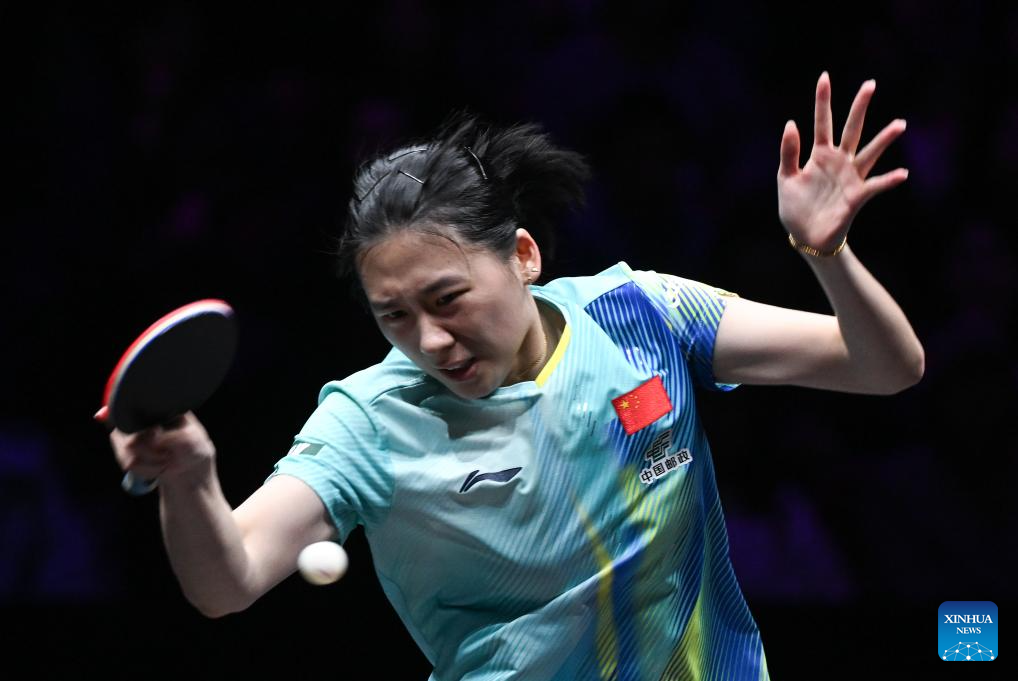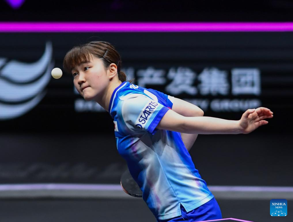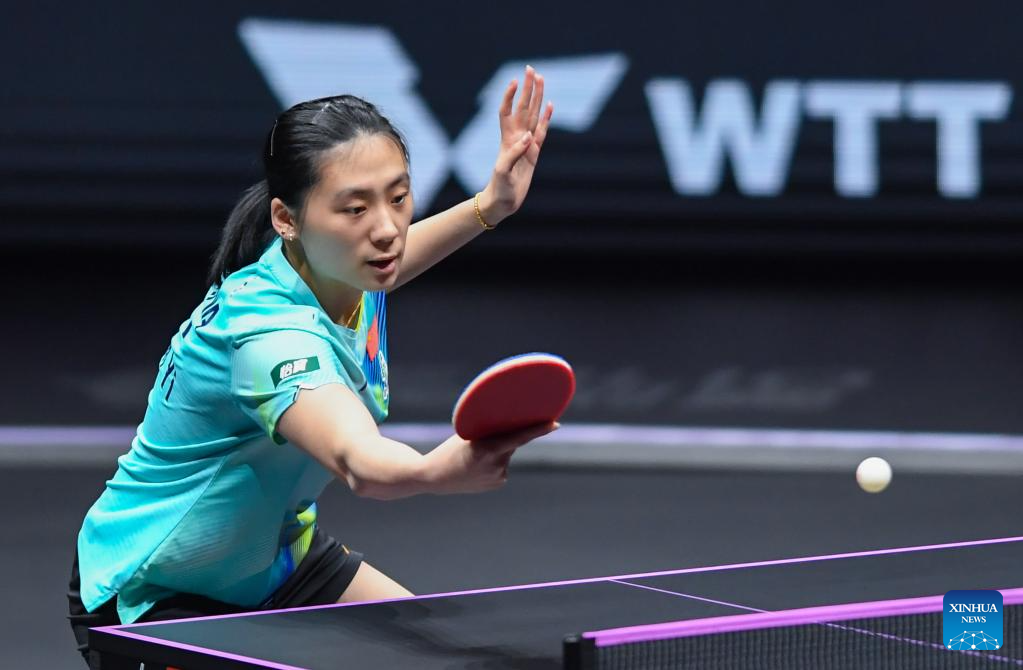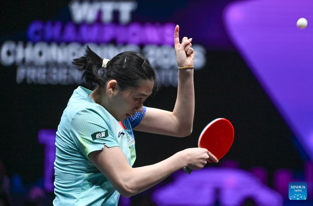 Wang Yidi of China hits a return during the women's singles quarterfinal between Wang Yidi of China and Shin Yubin of South Korea at the WTT Champions Chongqing 2026 in southwest China's Chongqing, March 14, 2026. (Xinhua/Tang Yi)