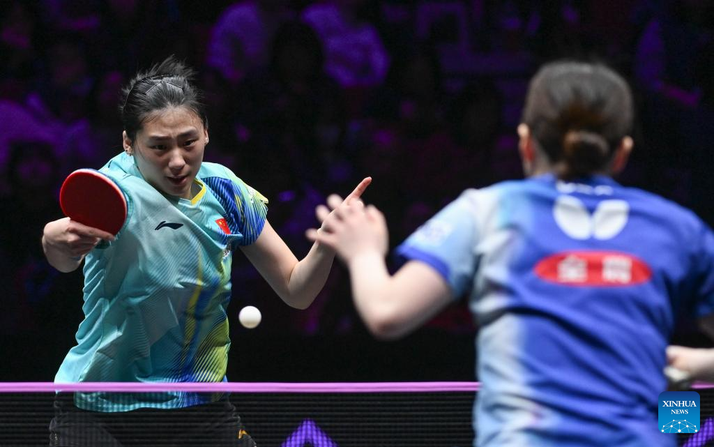 Shin Yubin (R) of South Korea hits a return during the women's singles quarterfinal between Wang Yidi of China and Shin Yubin of South Korea at the WTT Champions Chongqing 2026 in southwest China's Chongqing, March 14, 2026. (Xinhua/Huang Wei)