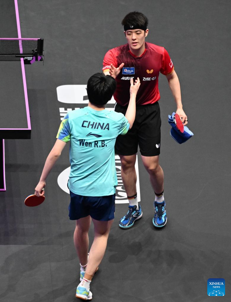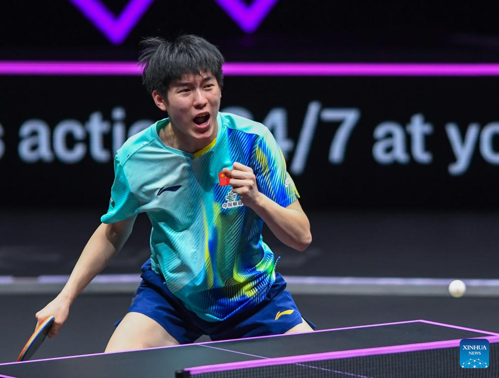 Wen Ruibo of China celebrates after winning the men's singles quarterfinal match between Wen Ruibo of China and Qiu Dang of Germany at the WTT Champions Chongqing 2026 in southwest China's Chongqing, March 14, 2026. (Xinhua/Tang Yi)