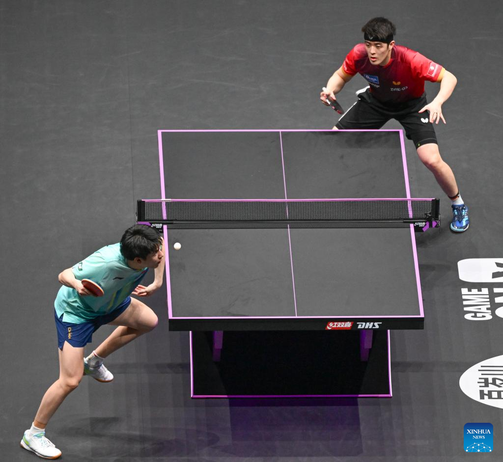 Wen Ruibo (L) of China and Qiu Dang of Germany compete during the men's singles quarterfinal match at the WTT Champions Chongqing 2026 in southwest China's Chongqing, March 14, 2026. (Xinhua/Chen Cheng)