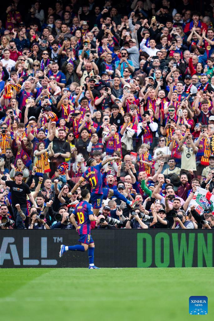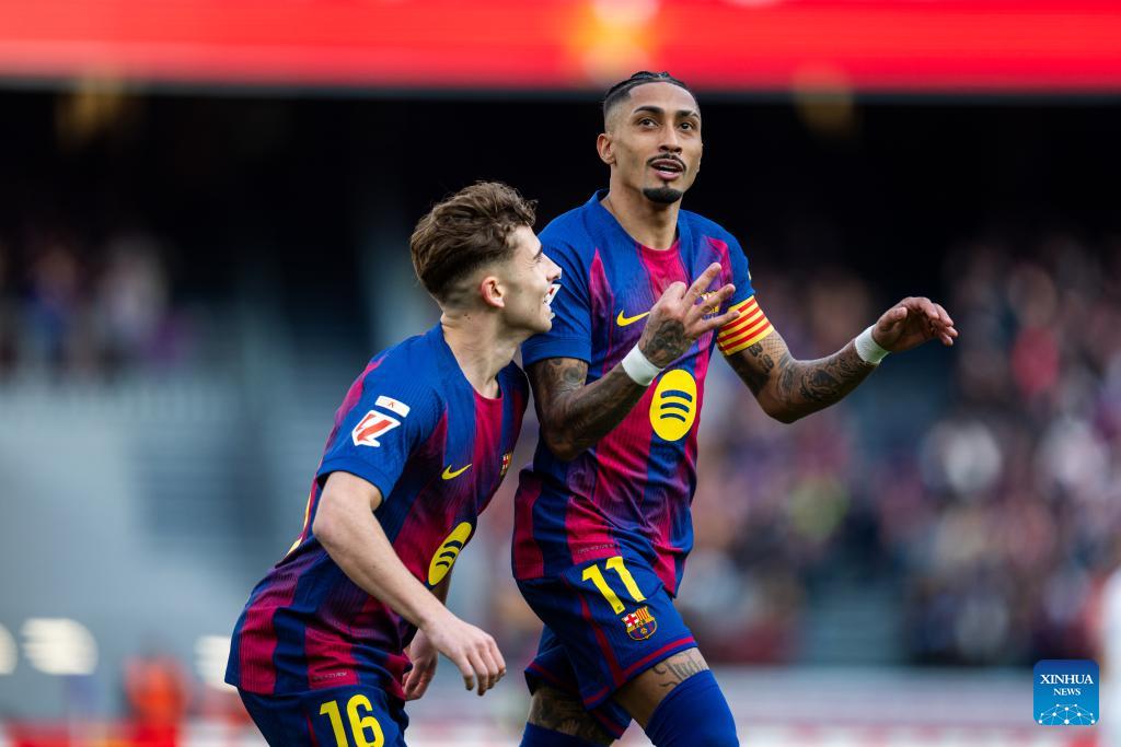 Barcelona's Raphinha celebrates his goal during the La Liga football match between Barcelona and Sevilla FC in Barcelona, Spain, on March 15, 2026. (Photo by Joan Gosa/Xinhua)