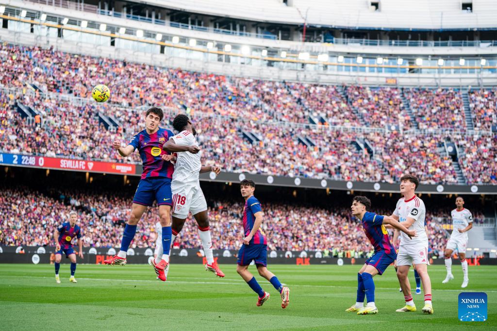 Barcelona's Pau Cubarsi (Top L) heads the ball with Lucien Agoume (Top R) of Sevilla FC during the La Liga football match between Barcelona and Sevilla FC in Barcelona, Spain, on March 15, 2026. (Photo by Joan Gosa/Xinhua)
