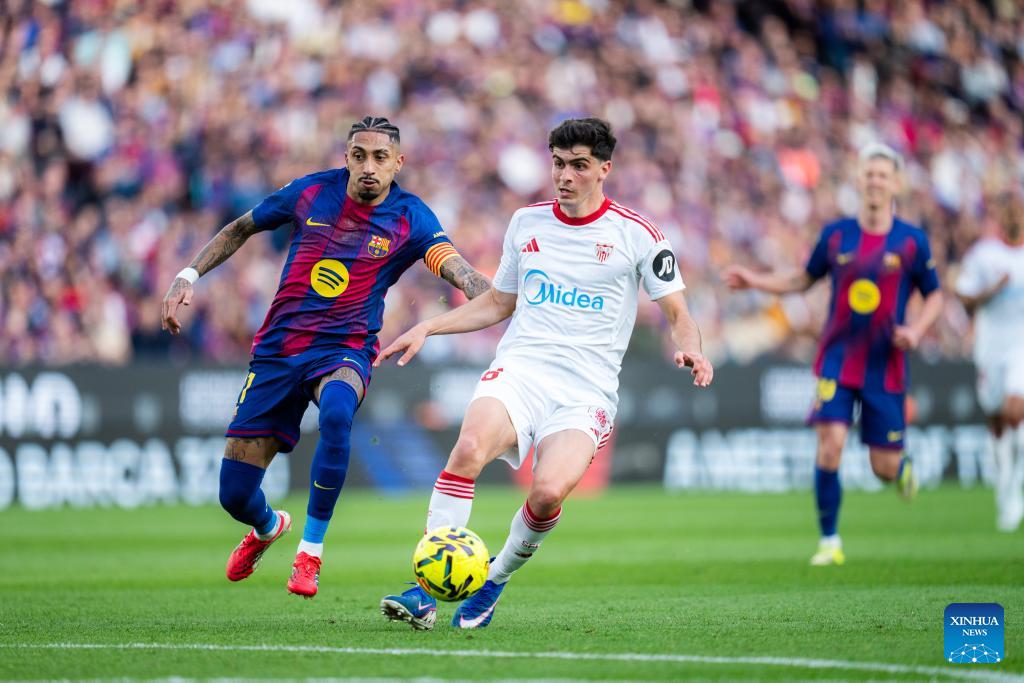 Barcelona's Raphinha (L) vies with Juanlu Sanchez of Sevilla FC during the La Liga football match between Barcelona and Sevilla FC in Barcelona, Spain, on March 15, 2026. (Photo by Joan Gosa/Xinhua)