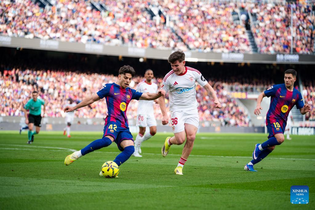 Barcelona's Xavi Espart (L) vies with Oso (2nd R) of Sevilla FC during the La Liga football match between Barcelona and Sevilla FC in Barcelona, Spain, on March 15, 2026. (Photo by Joan Gosa/Xinhua)